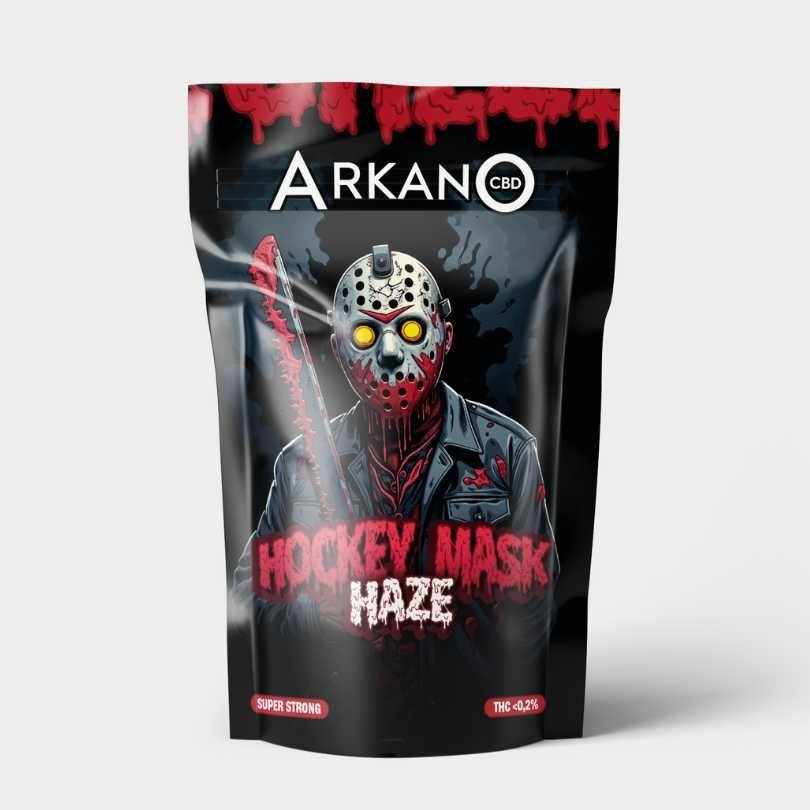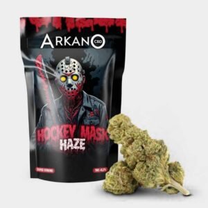 Arkano CBD presenta Hockey Mask Haze, una flor californiana de moderadamente alta concentración de cannabinoides, con cogollos muy bien formados y compactos, de un verde intenso.