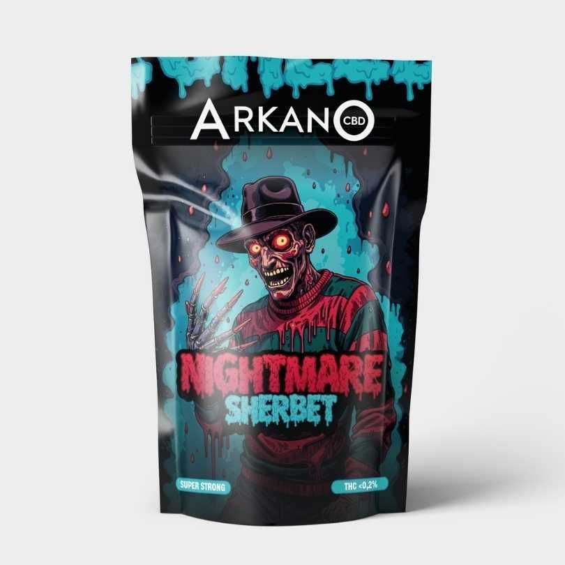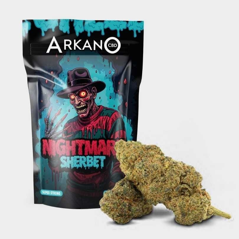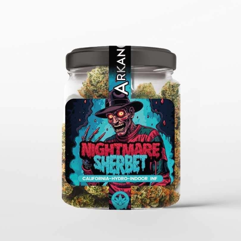 Nightmare Sherbet es el resultado de un minucioso proceso de selección e hibridación que logra una flor de cáñamo de calidad, a la que se la infunde para reforzar su concentración de cannabinoides.